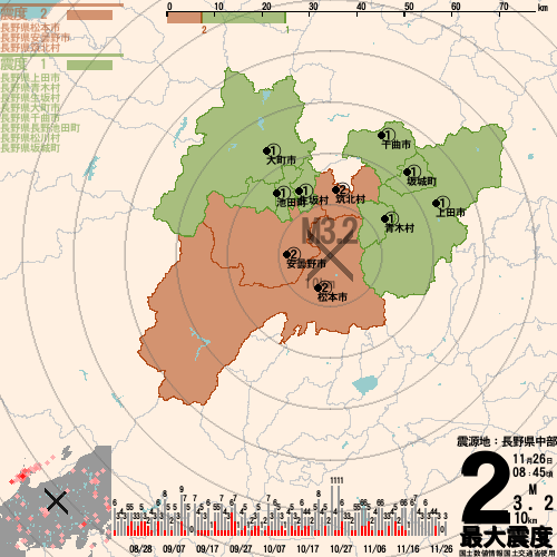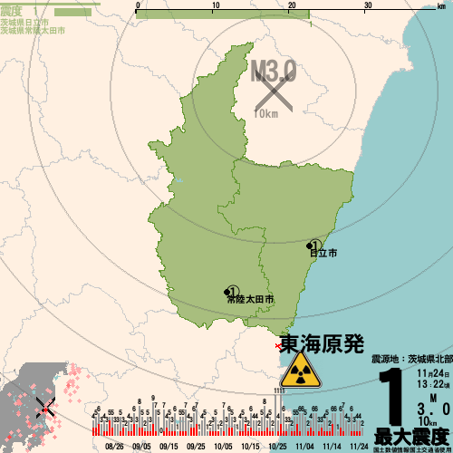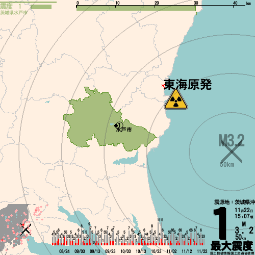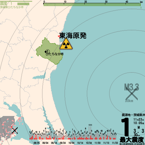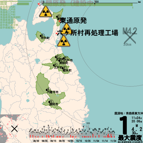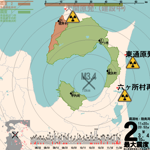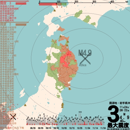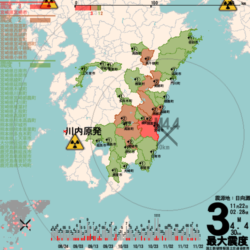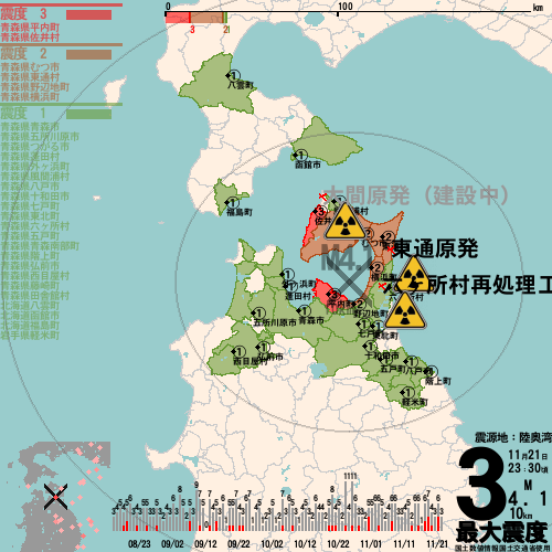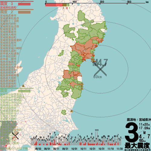 日本の地震の震度情報を、市区町村単位で、地図に描きます。地震は、地盤によって意外な揺れ方をしており、一概に近いほど揺れている訳ではありません。震度3以上の地震はプッシュ通知でお知らせします。津波注意報・津波警報が出ている場合、その旨を文字とともに、海を赤色に描画して警告します。過去の地震も閲覧できます。原子力発電所との位置関係を把握可能。