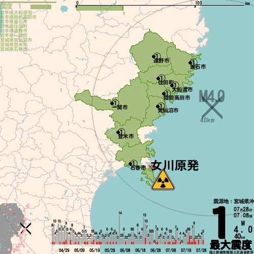 日本の地震の震度情報を、市区町村単位で、地図に描きます。地震は、地盤によって意外な揺れ方をしており、一概に近いほど揺れている訳ではありません。震度3以上の地震はプッシュ通知でお知らせします。津波注意報・津波警報が出ている場合、その旨を文字とともに、海を赤色に描画して警告します。過去の地震も閲覧できます。原子力発電所との位置関係を把握可能。