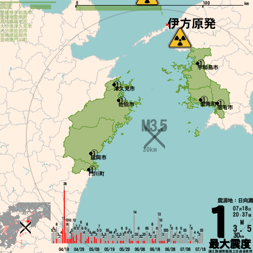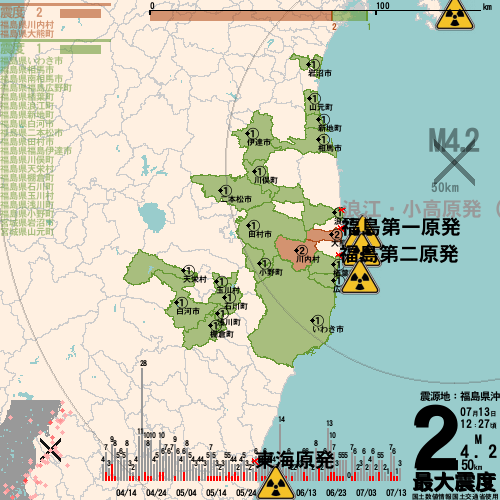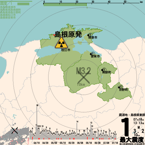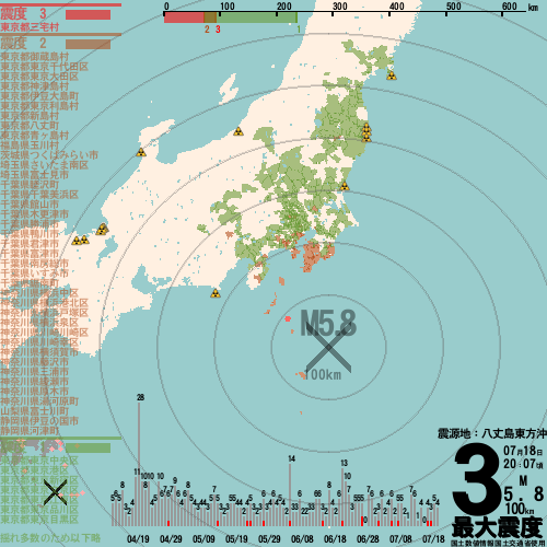 日本の地震の震度情報を、市区町村単位で、地図に描きます。地震は、地盤によって意外な揺れ方をしており、一概に近いほど揺れている訳ではありません。震度3以上の地震はプッシュ通知でお知らせします。津波注意報・津波警報が出ている場合、その旨を文字とともに、海を赤色に描画して警告します。過去の地震も閲覧できます。原子力発電所との位置関係を把握可能。