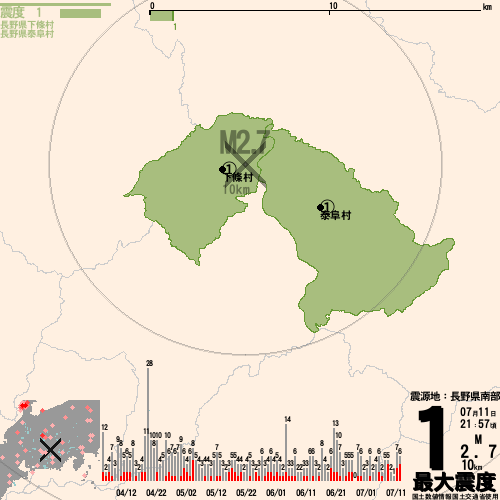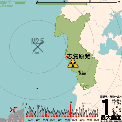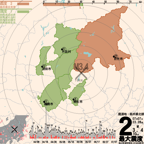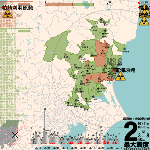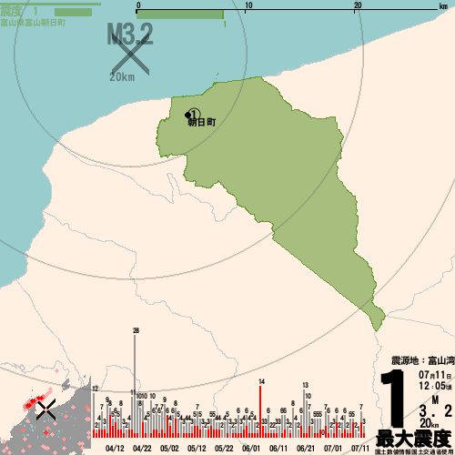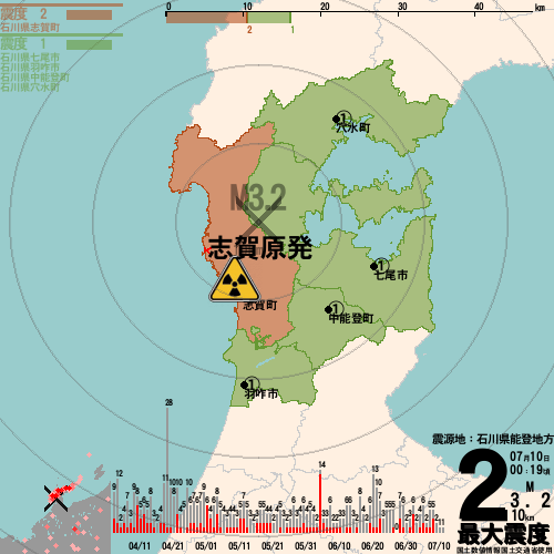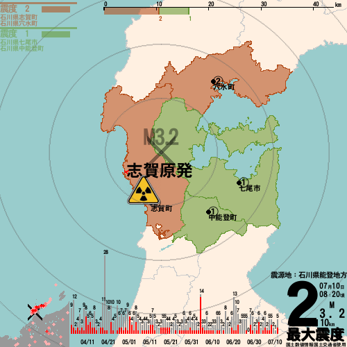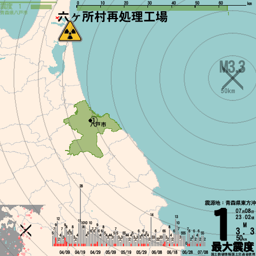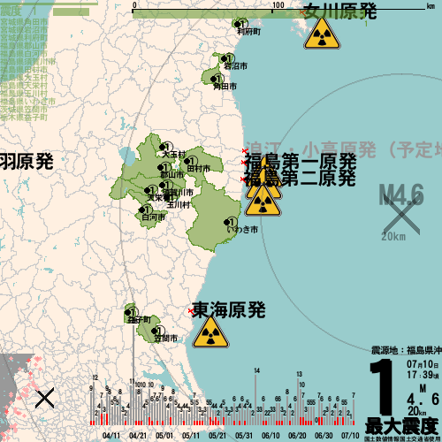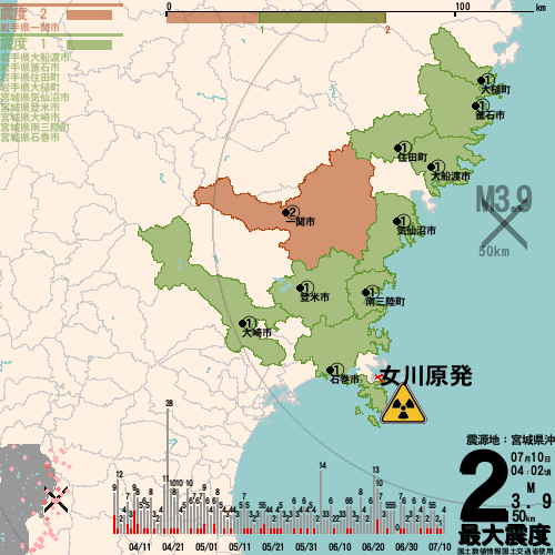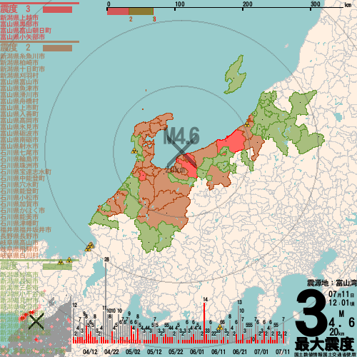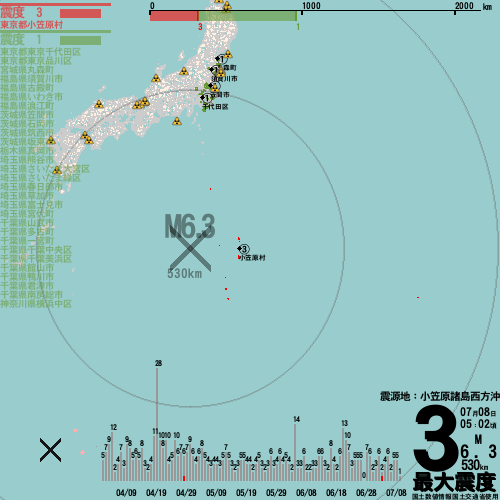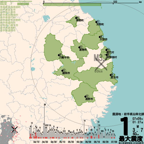 日本の地震の震度情報を、市区町村単位で、地図に描きます。地震は、地盤によって意外な揺れ方をしており、一概に近いほど揺れている訳ではありません。震度3以上の地震はプッシュ通知でお知らせします。津波注意報・津波警報が出ている場合、その旨を文字とともに、海を赤色に描画して警告します。過去の地震も閲覧できます。原子力発電所との位置関係を把握可能。