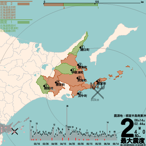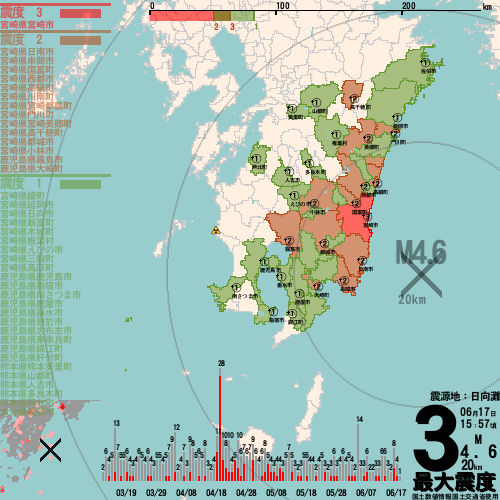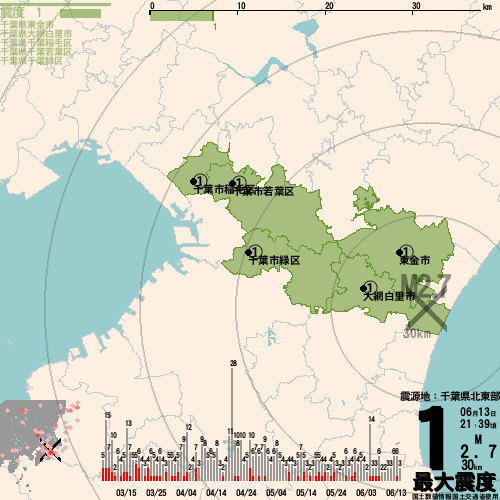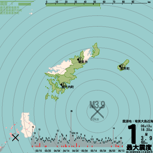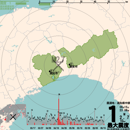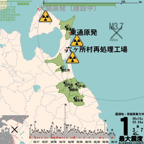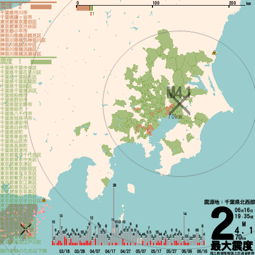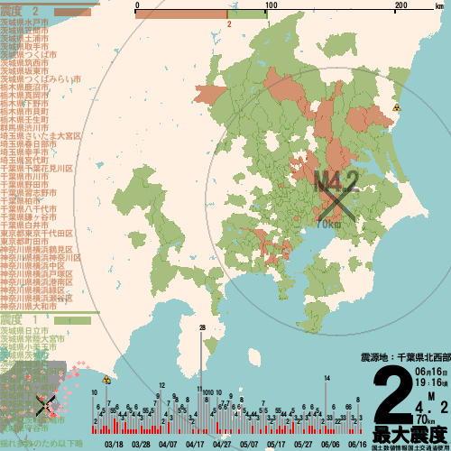 日本の地震の震度情報を、市区町村単位で、地図に描きます。地震は、地盤によって意外な揺れ方をしており、一概に近いほど揺れている訳ではありません。震度3以上の地震はプッシュ通知でお知らせします。津波注意報・津波警報が出ている場合、その旨を文字とともに、海を赤色に描画して警告します。過去の地震も閲覧できます。原子力発電所との位置関係を把握可能。