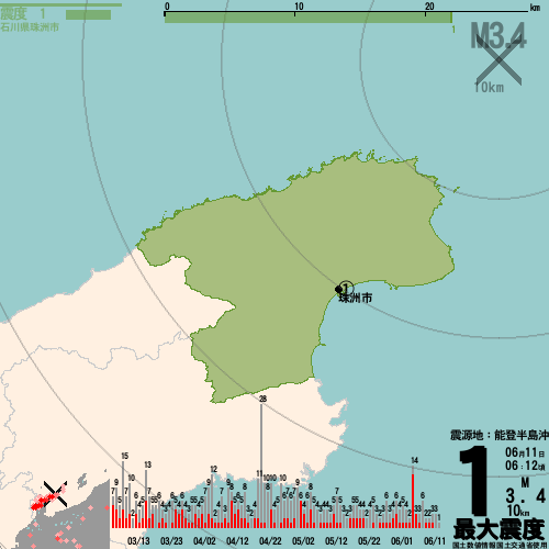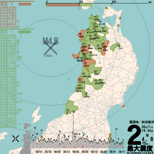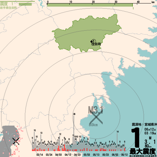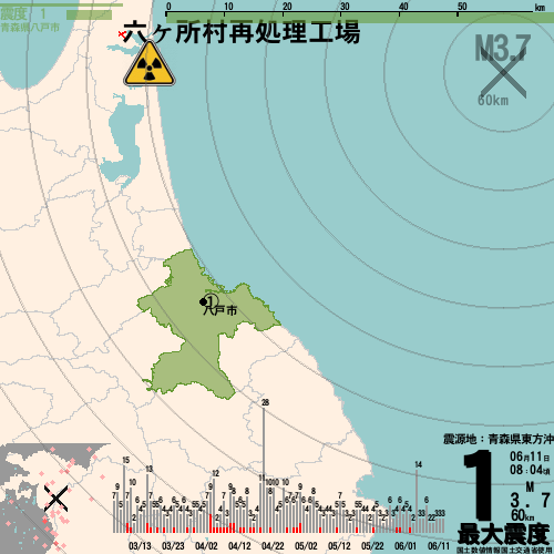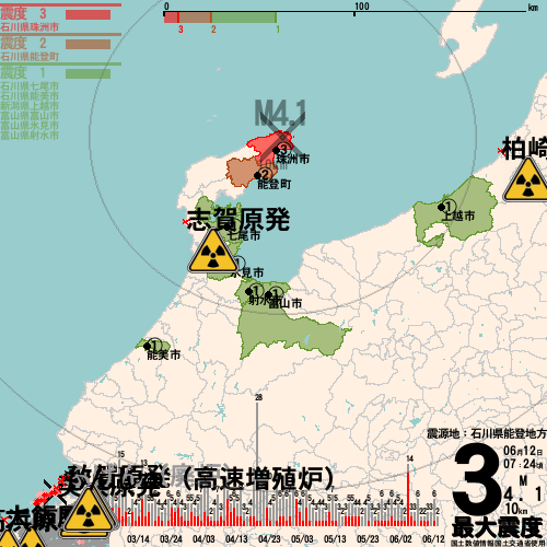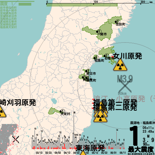 日本の地震の震度情報を、市区町村単位で、地図に描きます。地震は、地盤によって意外な揺れ方をしており、一概に近いほど揺れている訳ではありません。震度3以上の地震はプッシュ通知でお知らせします。津波注意報・津波警報が出ている場合、その旨を文字とともに、海を赤色に描画して警告します。過去の地震も閲覧できます。原子力発電所との位置関係を把握可能。