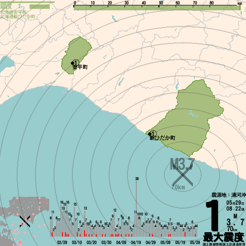 日本で起きた地震を、震度1以上を対象に描画。震度3以上の地震についてはプッシュ通知。津波注意報・津波警報が出ている場合、その旨を文字とともに、海を赤色に描画して警告。過去10回の地震の閲覧。Twitterでのスムーズな情報共有。地図の生成には、気象庁の公開している地震情報と、国土交通省の国土数値情報(行政区域・湖沼・市区町村役場)を利用しています。