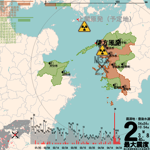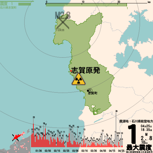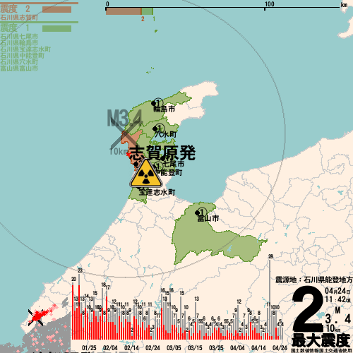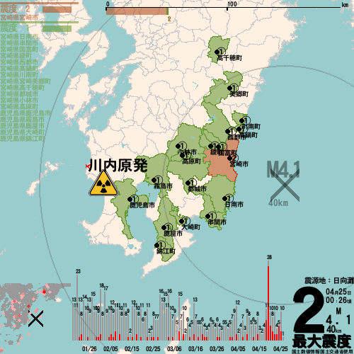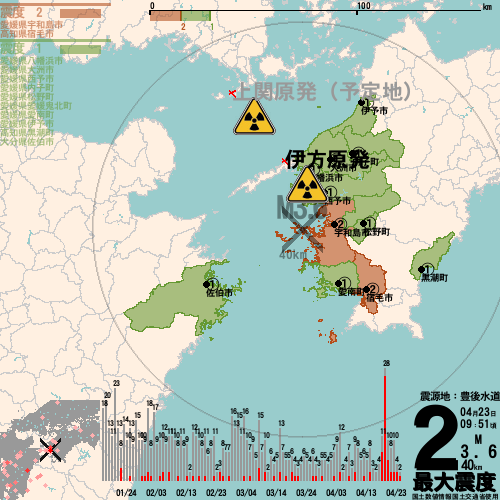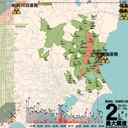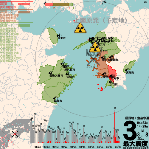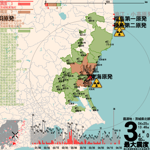 日本の地震の震度情報を、市区町村単位で、地図に描きます。地震は、地盤によって意外な揺れ方をしており、一概に近いほど揺れている訳ではありません。震度3以上の地震はプッシュ通知でお知らせします。津波注意報・津波警報が出ている場合、その旨を文字とともに、海を赤色に描画して警告します。過去の地震も閲覧できます。原子力発電所との位置関係を把握可能。
