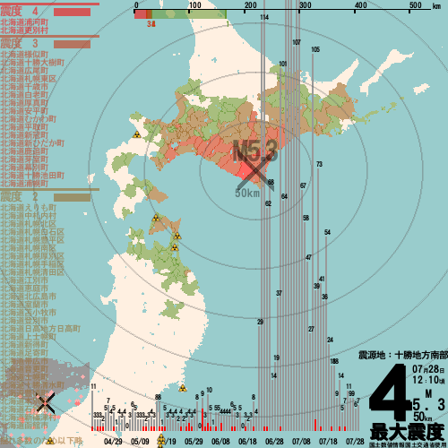 日本の地震の震度情報を、市区町村単位で、地図に描きます。地震は、地盤によって意外な揺れ方をしており、一概に近いほど揺れている訳ではありません。震度3以上の地震はプッシュ通知でお知らせします。津波注意報・津波警報が出ている場合、その旨を文字とともに、海を赤色に描画して警告します。過去の地震も閲覧できます。原子力発電所との位置関係を把握可能。