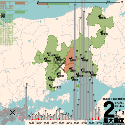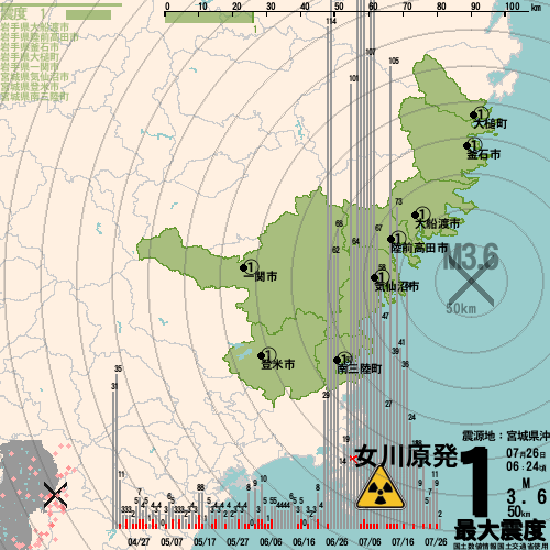 日本の地震の震度情報を、市区町村単位で、地図に描きます。地震は、地盤によって意外な揺れ方をしており、一概に近いほど揺れている訳ではありません。震度3以上の地震はプッシュ通知でお知らせします。津波注意報・津波警報が出ている場合、その旨を文字とともに、海を赤色に描画して警告します。過去の地震も閲覧できます。原子力発電所との位置関係を把握可能。