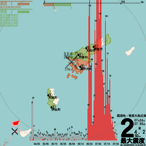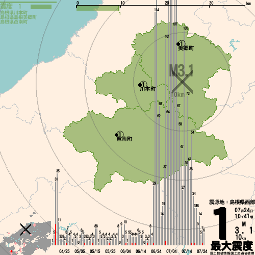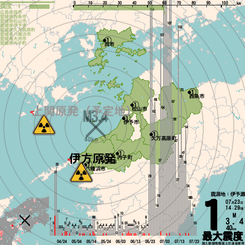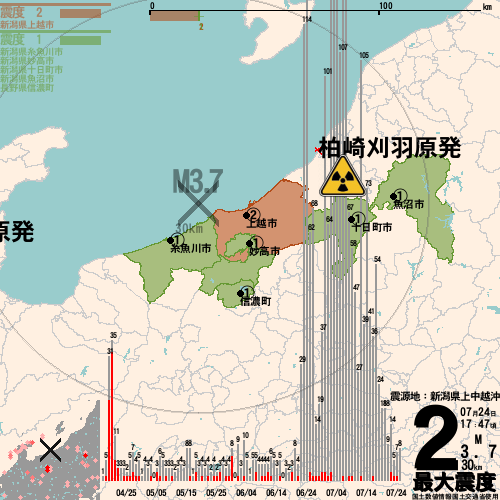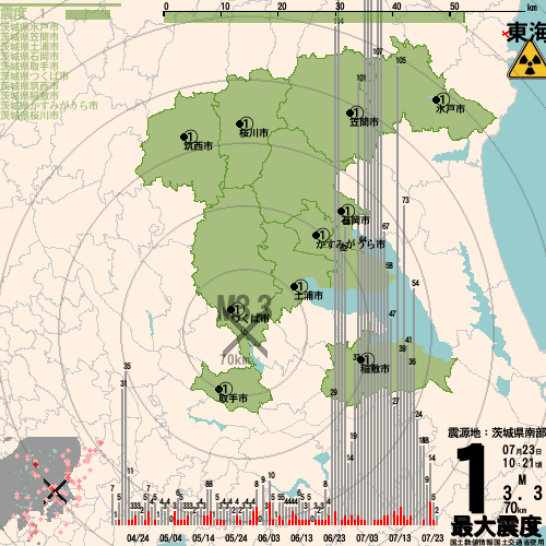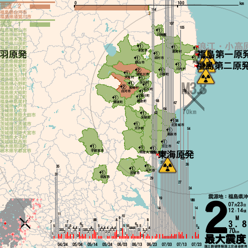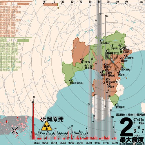 日本の地震の震度情報を、市区町村単位で、地図に描きます。地震は、地盤によって意外な揺れ方をしており、一概に近いほど揺れている訳ではありません。震度3以上の地震はプッシュ通知でお知らせします。津波注意報・津波警報が出ている場合、その旨を文字とともに、海を赤色に描画して警告します。過去の地震も閲覧できます。原子力発電所との位置関係を把握可能。