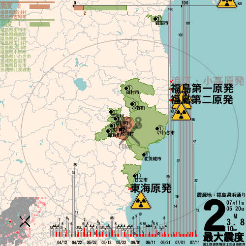 日本の地震の震度情報を、市区町村単位で、地図に描きます。地震は、地盤によって意外な揺れ方をしており、一概に近いほど揺れている訳ではありません。震度3以上の地震はプッシュ通知でお知らせします。津波注意報・津波警報が出ている場合、その旨を文字とともに、海を赤色に描画して警告します。過去の地震も閲覧できます。原子力発電所との位置関係を把握可能。