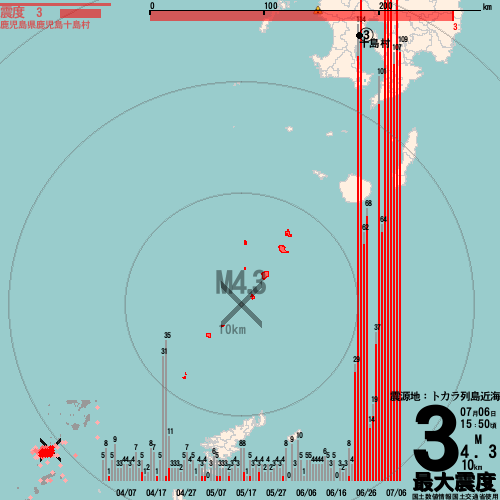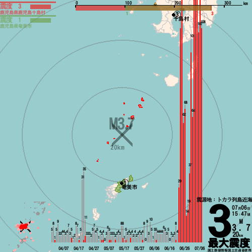 日本の地震の震度情報を、市区町村単位で、地図に描きます。地震は、地盤によって意外な揺れ方をしており、一概に近いほど揺れている訳ではありません。震度3以上の地震はプッシュ通知でお知らせします。津波注意報・津波警報が出ている場合、その旨を文字とともに、海を赤色に描画して警告します。過去の地震も閲覧できます。原子力発電所との位置関係を把握可能。