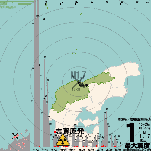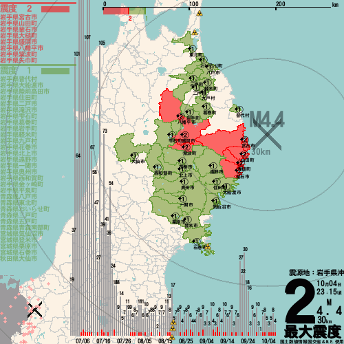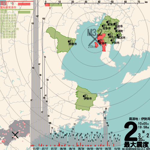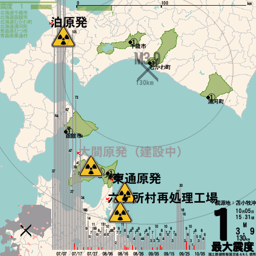 日本の地震の震度情報を、市区町村単位で、地図に描きます。地震は、地盤によって意外な揺れ方をしており、一概に近いほど揺れている訳ではありません。震度3以上の地震はプッシュ通知でお知らせします。津波注意報・津波警報が出ている場合、その旨を文字とともに、海を赤色に描画して警告します。過去の地震も閲覧できます。原子力発電所との位置関係を把握可能。