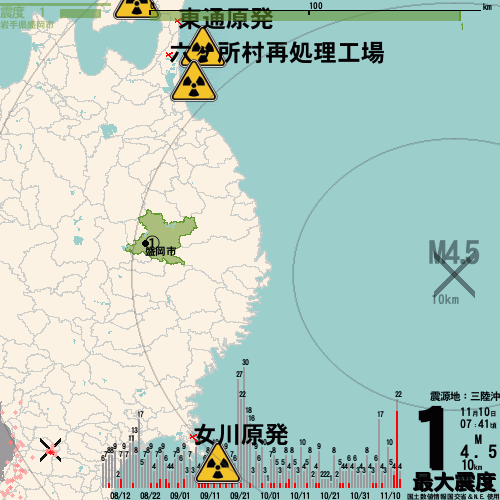 日本の地震の震度情報を、市区町村単位で、地図に描きます。地震は、地盤によって意外な揺れ方をしており、一概に近いほど揺れている訳ではありません。震度3以上の地震はプッシュ通知でお知らせします。津波注意報・津波警報が出ている場合、その旨を文字とともに、海を赤色に描画して警告します。過去の地震も閲覧できます。原子力発電所との位置関係を把握可能。