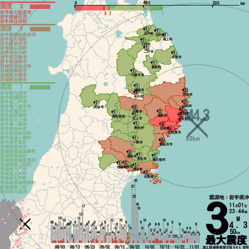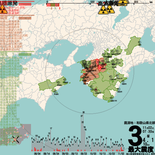 日本の地震の震度情報を、市区町村単位で、地図に描きます。地震は、地盤によって意外な揺れ方をしており、一概に近いほど揺れている訳ではありません。震度3以上の地震はプッシュ通知でお知らせします。津波注意報・津波警報が出ている場合、その旨を文字とともに、海を赤色に描画して警告します。過去の地震も閲覧できます。原子力発電所との位置関係を把握可能。