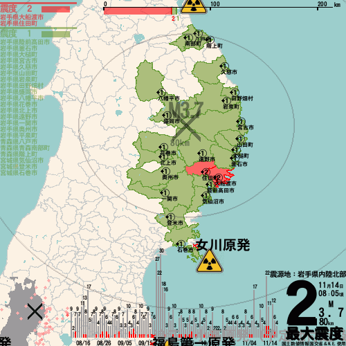 日本の地震の震度情報を、市区町村単位で、地図に描きます。地震は、地盤によって意外な揺れ方をしており、一概に近いほど揺れている訳ではありません。震度3以上の地震はプッシュ通知でお知らせします。津波注意報・津波警報が出ている場合、その旨を文字とともに、海を赤色に描画して警告します。過去の地震も閲覧できます。原子力発電所との位置関係を把握可能。