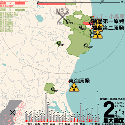日本の地震の震度情報を、市区町村単位で、地図に描きます。地震は、地盤によって意外な揺れ方をしており、一概に近いほど揺れている訳ではありません。震度3以上の地震はプッシュ通知でお知らせします。津波注意報・津波警報が出ている場合、その旨を文字とともに、海を赤色に描画して警告します。過去の地震も閲覧できます。原子力発電所との位置関係を把握可能。