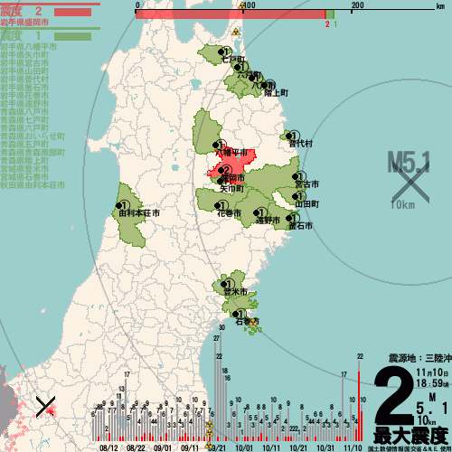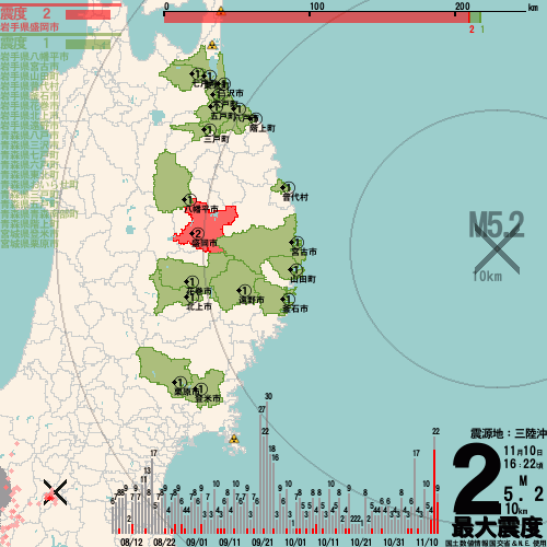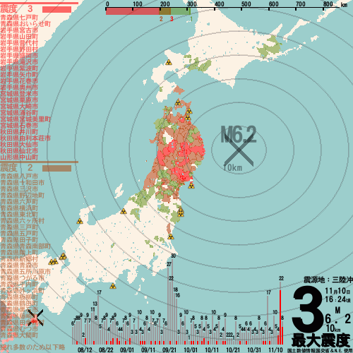 日本の地震の震度情報を、市区町村単位で、地図に描きます。地震は、地盤によって意外な揺れ方をしており、一概に近いほど揺れている訳ではありません。震度3以上の地震はプッシュ通知でお知らせします。津波注意報・津波警報が出ている場合、その旨を文字とともに、海を赤色に描画して警告します。過去の地震も閲覧できます。原子力発電所との位置関係を把握可能。