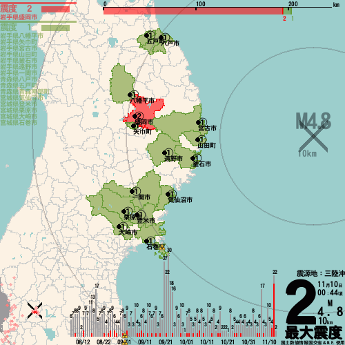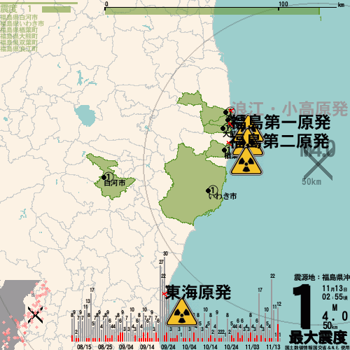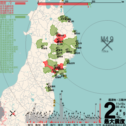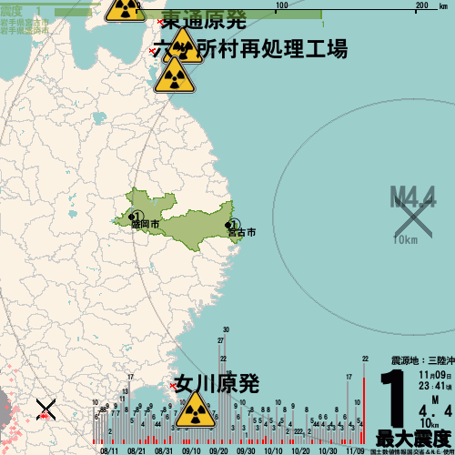 日本の地震の震度情報を、市区町村単位で、地図に描きます。地震は、地盤によって意外な揺れ方をしており、一概に近いほど揺れている訳ではありません。震度3以上の地震はプッシュ通知でお知らせします。津波注意報・津波警報が出ている場合、その旨を文字とともに、海を赤色に描画して警告します。過去の地震も閲覧できます。原子力発電所との位置関係を把握可能。