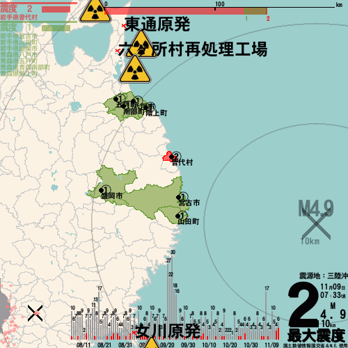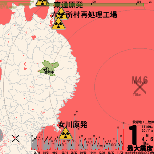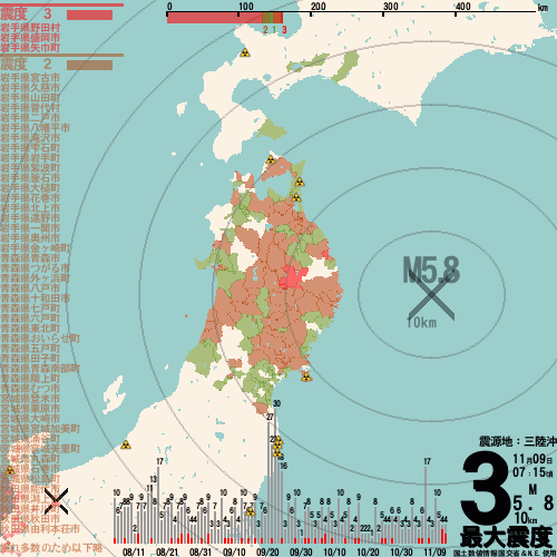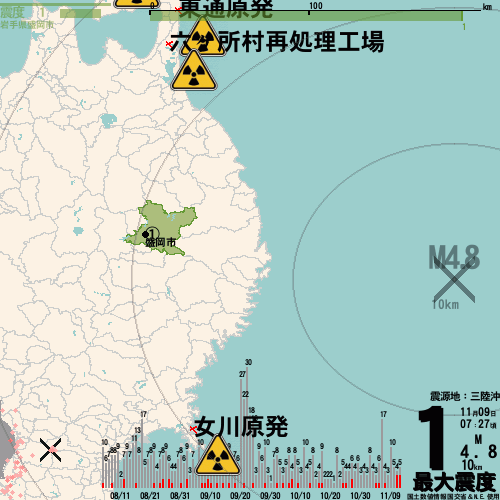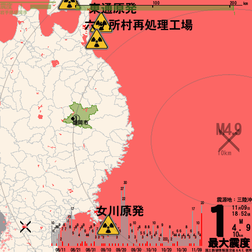 日本の地震の震度情報を、市区町村単位で、地図に描きます。地震は、地盤によって意外な揺れ方をしており、一概に近いほど揺れている訳ではありません。震度3以上の地震はプッシュ通知でお知らせします。津波注意報・津波警報が出ている場合、その旨を文字とともに、海を赤色に描画して警告します。過去の地震も閲覧できます。原子力発電所との位置関係を把握可能。